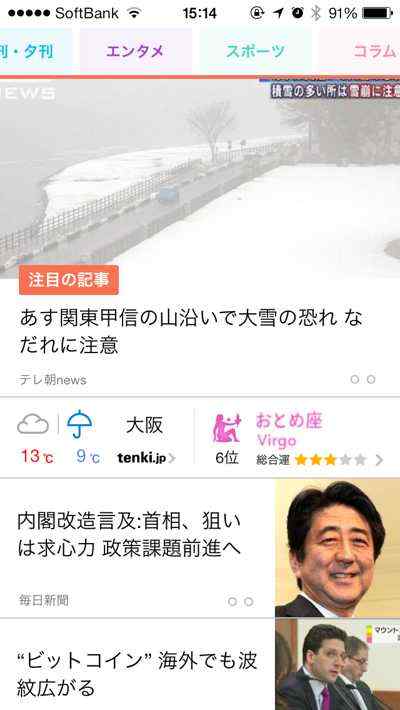 このバージョン4からは、それぞれのカテゴリ(スポーツやエンタメ、経済など…)のニュースをGunosy1つで見れるようになったのです。