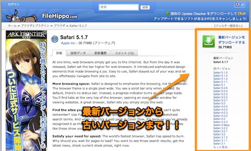 Safariについてのページが表示されます。 右部分、枠で囲ってある部分に注目です。最新バージョンから古いバージョンまでダウンロードすることが可能です!!