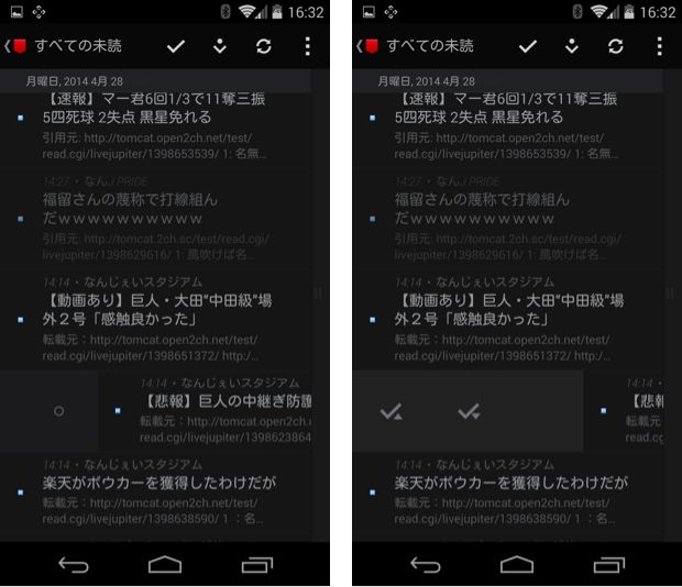 少し右スワイプすると未読・既読の変更、大きく右スワイプするとこの記事より上・この記事より下のどちらかを全て既読にすることが可能です。