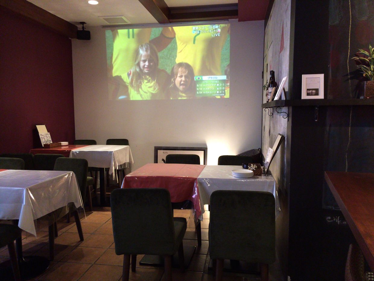 店内はカウンター10席弱、テーブルで30席ないぐらい?(テーブル7つぐらい)で、プロジェクターにはサッカーが。