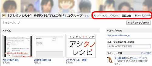 そして、表示されている「写真」とか「ドキュメント」とかをクリックすると、 もちろんその画面に飛びます! 確認できるのは、メンバー一覧、イベントの作成、写真の表示、ドキュメントの表示です。