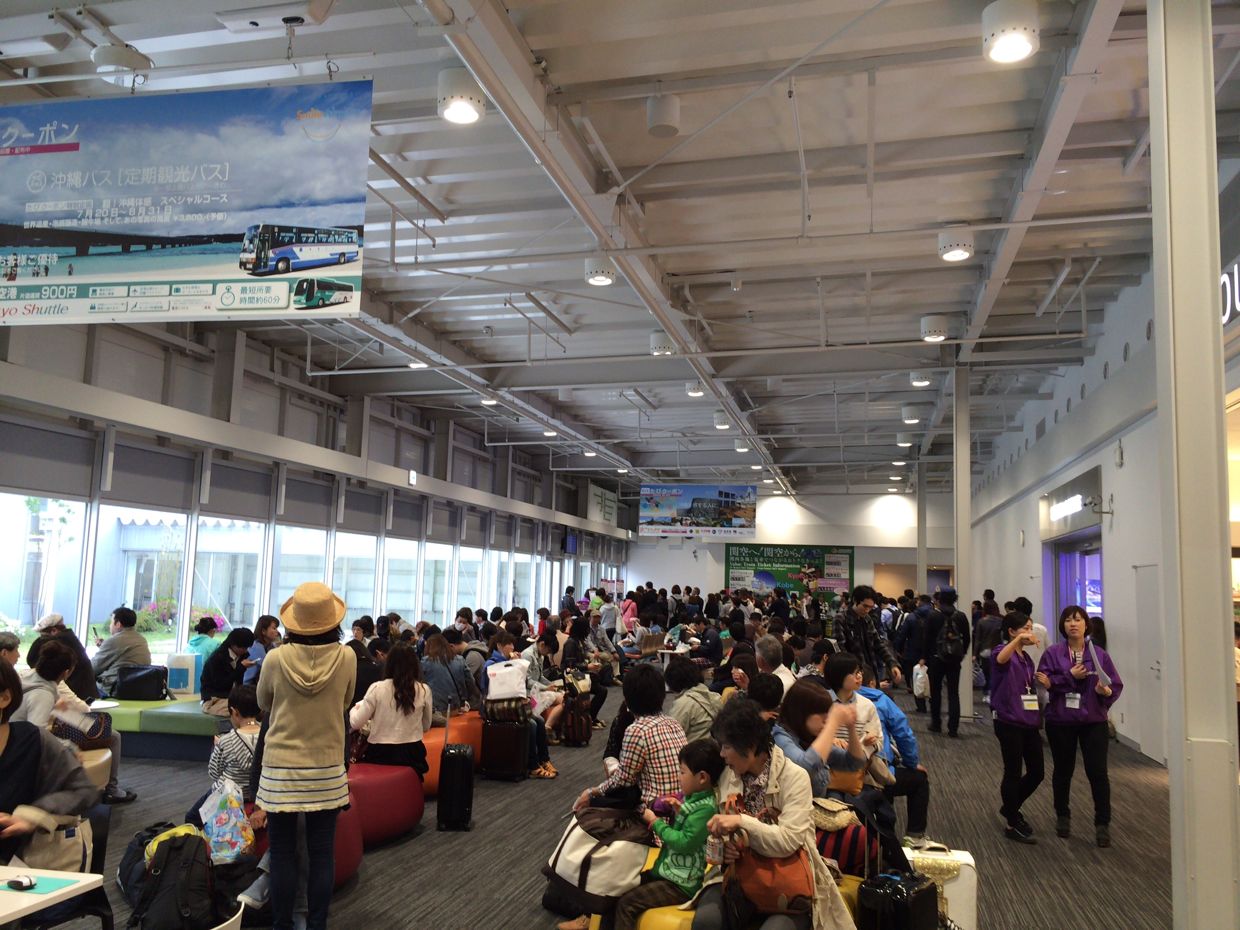 保安検査場を通過。作りがしょぼいです。仕方ないけども。 ちなみにこの日は成田行きが欠航してて混雑。